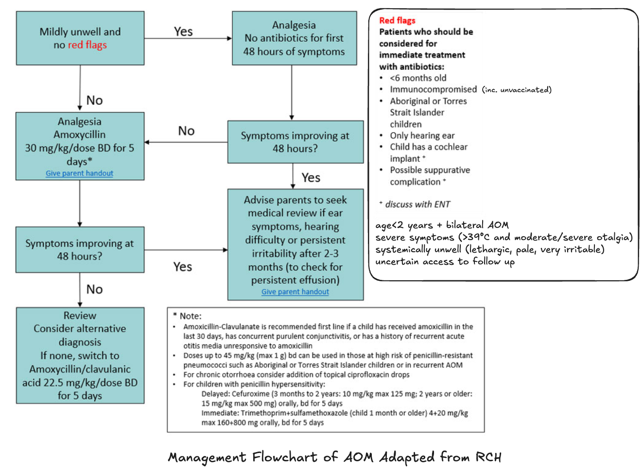- Persistent OME or recurrent AOM → oral amoxicillin 25/kg/dose (max 1g) 12 hourly