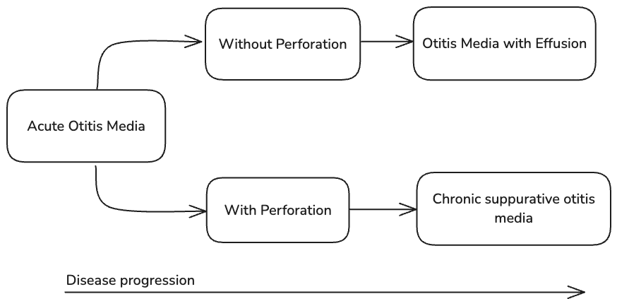 - Recurrent acute otitis media ⇒ ≥3 episodes of AOM within 6 months or ≥4 episodes in 12 months