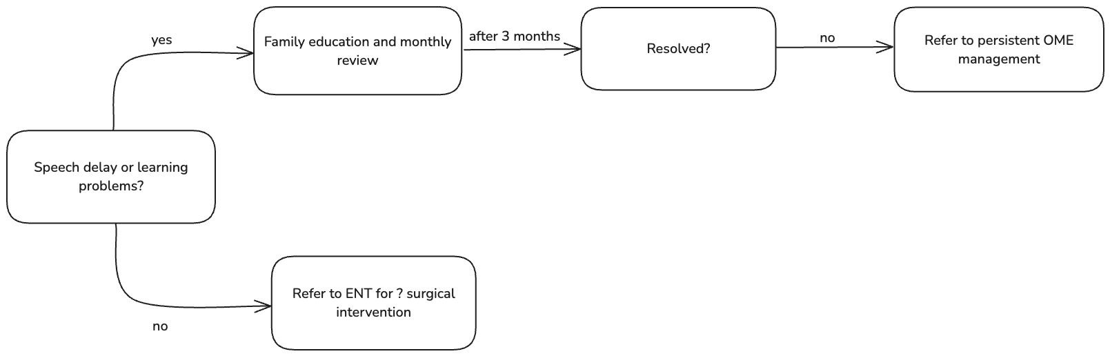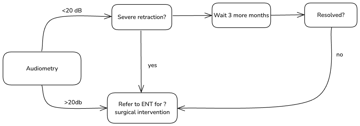 - If hearing loss >20 dB or persistent OME for 3 months (6 months altogether) and/or speech and language delay → refer for ENT assessment for possible surgical intervention
