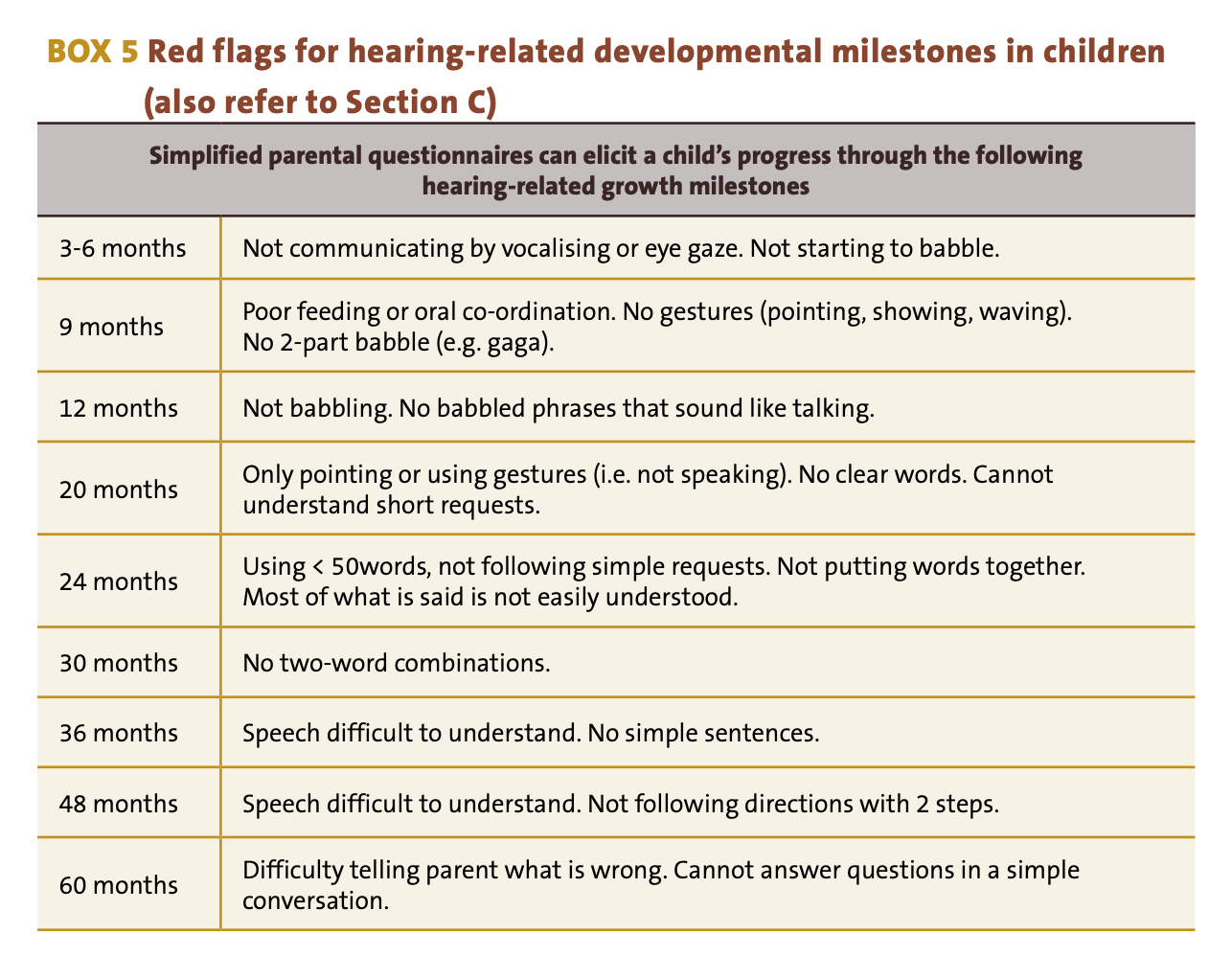 - Discuss the importance of going to the health centre if their child develops ear discharge, pain, or if they have concerns about language development