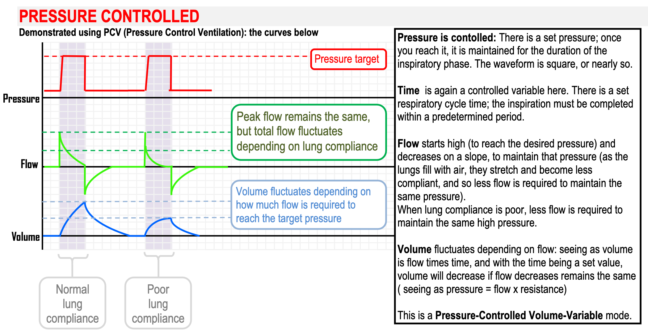 • Pressure control maintains a stable pressure in the face of fluctuating respiratory performance, which prevents lung injury from excess pressure but doesn’t give a consistent minute ventilation