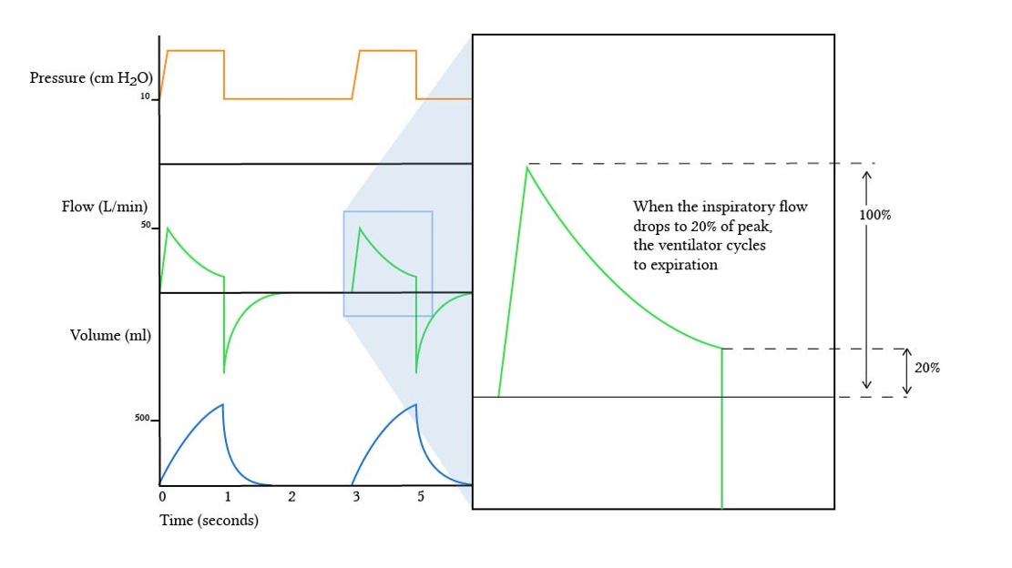 • The ventilator cycles into the expiratory phase once the flow has decreased to a predetermined value during inspiration