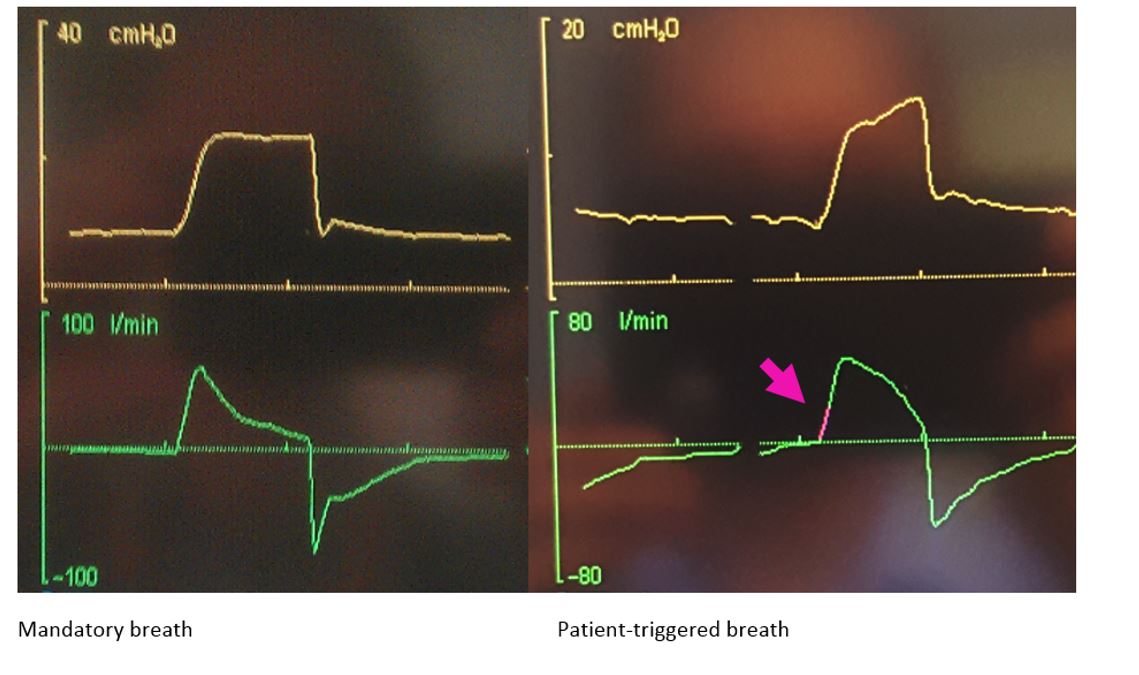 • Some machines indicate spontaneous respiratory effort by colouring the waveform