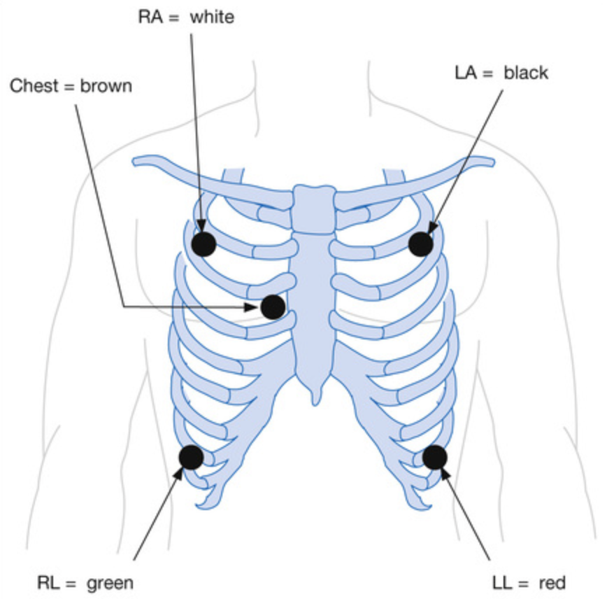 • 5-electrode system (gives leads I, II and III and a single unipolar lead depending on the position of the brown lead V1-6)