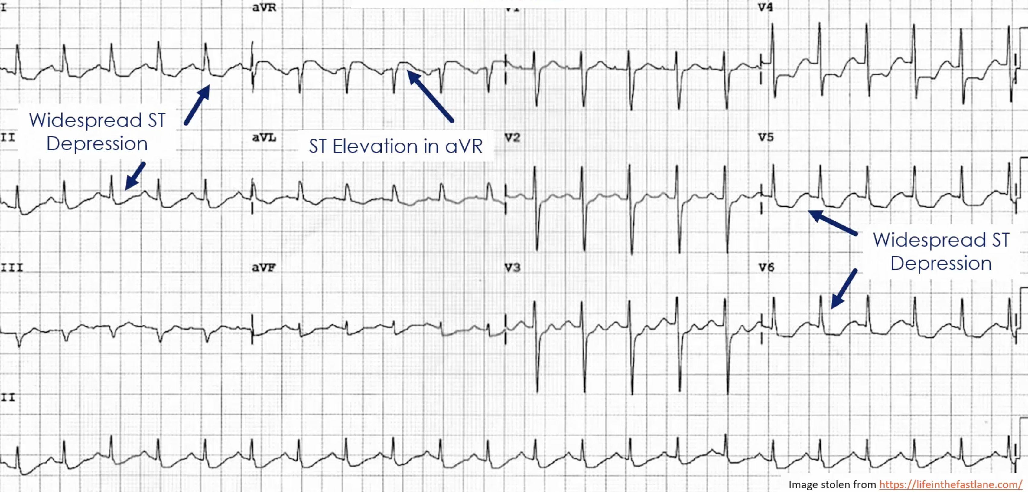 • Widespread ST depression in mostly leads I, II and V4-6