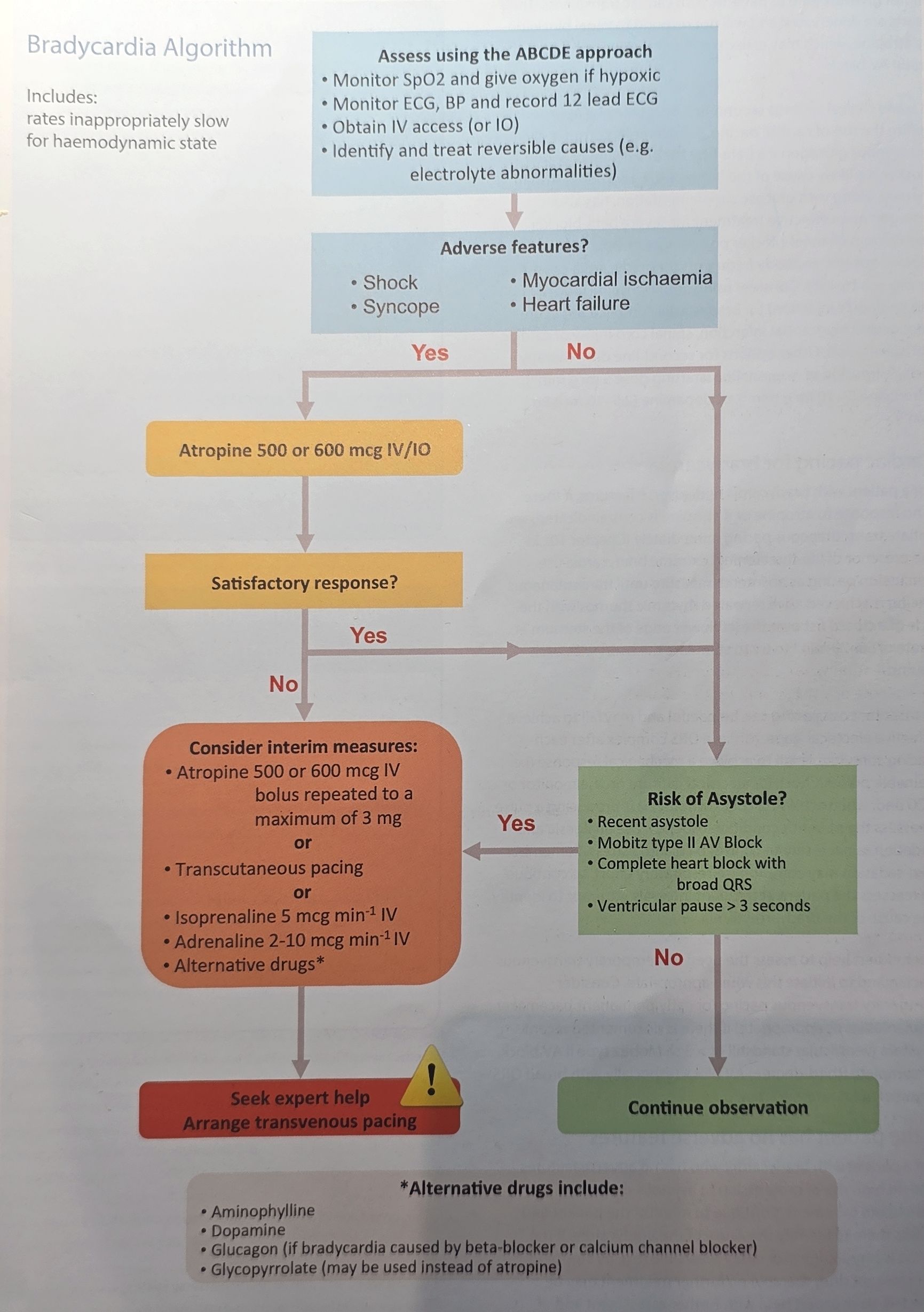 - Give atropine 500mcg IV rapid bolus and if necessary repeat every 3-5 minutes to a total of 3mg (doses of atropine given slowly or of <500mcg can cause paradoxical slowing of the heart rate